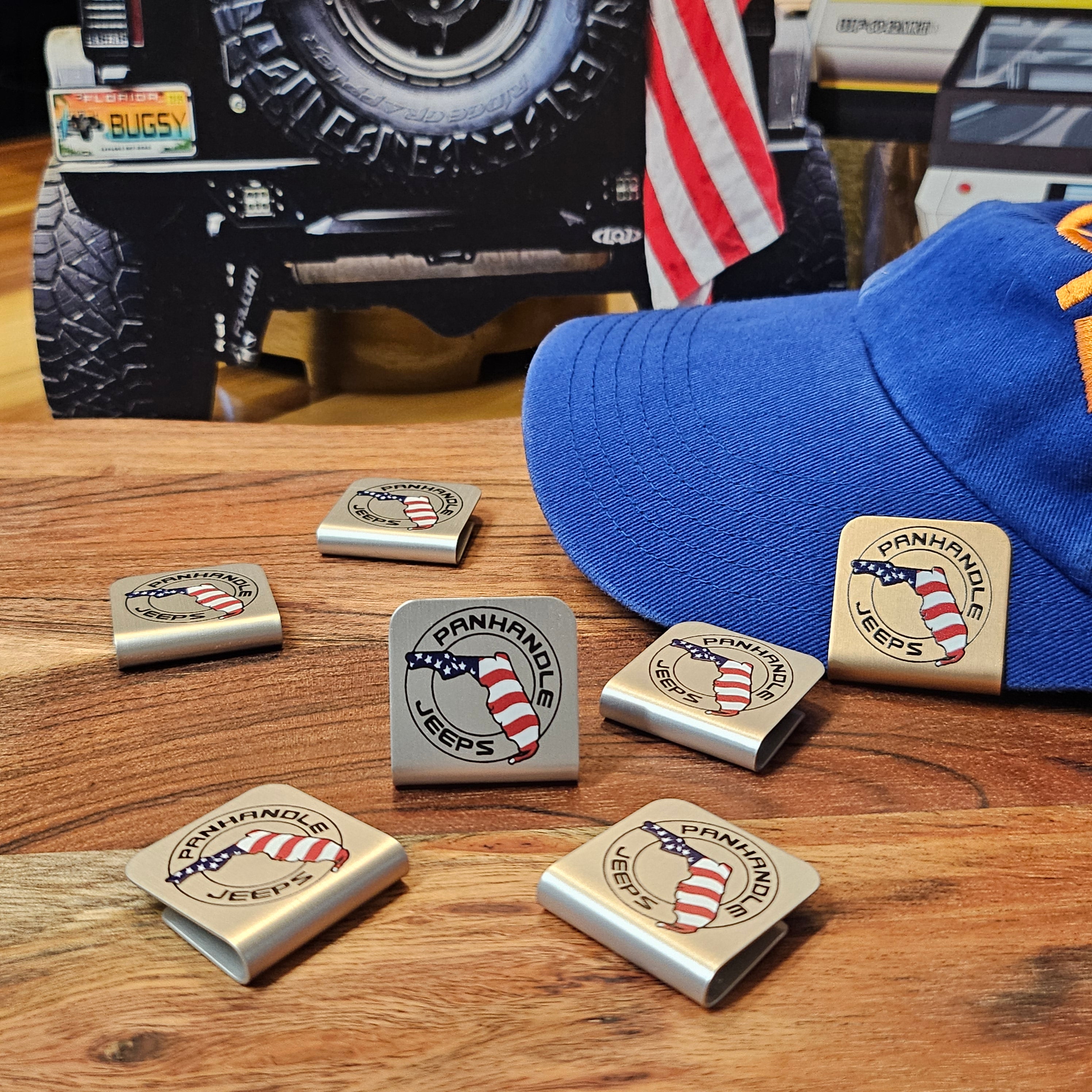 Getting ready to take a ride in your jeep? You'll need your hat before you go and what better way to represent Panhandle Jeeps than with our ready-to-wear aluminum hat clips to go on your hat.
